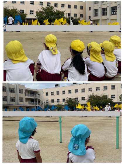 幼稚園の窓から、小学校のお兄さんお姉さんが運動会の演技をしている姿が見えました。子どもたちは早速、校庭の片隅で見せていただきました。かけ声のかっこよさ、きれいな旗の演技などにすっかり見入っており、益々、小学生に憧れの気持ちがふくらんだようでした。