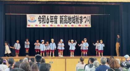 20日(日)に、新高地域秋まつりが新高小学校講堂で開催されました。自由参加でしたが、約半数の園児が参加しました。4歳児は運動会でも被った手作りのペンギン帽子を。5歳児は手裏剣のリストバンドを身に付けて、ニコニコ笑顔で演技をしました。地域の方に沢山の拍手をいただいてとても満足気でした。