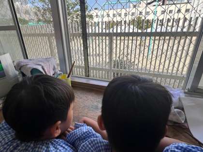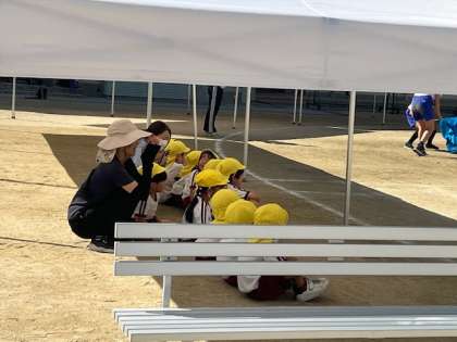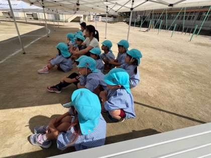 明日は新高小学校の運動会です。窓の外に旗を見つけ、6年生がフラッグをしていることに気付いた子どもたち。園児はこれまでに保育室の窓から練習している様子を見ていました。特に4歳児は、ある曲のときに、「ヘイ!」と発声するのを楽しみにしていましたので、今日、旗が見えたらすぐ「学校へ行きたい!」と言い出しました。続いて5歳児も、絵をかいていた手を止めて校庭へ。いよいよ最後の通し練習のときに児童が、パンパンッ!と手を叩いて「気合い!気合い!」、「集中しよう!」などと、自分や仲間を励ます言葉が聞こえてきました。このような主体的に取組む6年生の姿を見て、園児が憧れるのはもちろん、幼稚園の教員の方が感動して涙を浮かべてしまいました。終わった後で、本園の卒園児が、もと担任を見つけて、園児のそばに来て「新高幼稚園の子どもだったんだよ」と声をかけてくれました。「先生、すごい6年生の人を知ってるの?」と驚く園児に、「ずっと前、ほし組やもり組だったお兄さんやお姉さんだよ」と担任が知らせていました。新高幼稚園はもと新高小学校の併設幼稚園でした。こんなに成長した姿を見られるのも、隣接しているからこそ。小学生の姿を間近に見るだけでも就学前の大切な学びになると感じています。