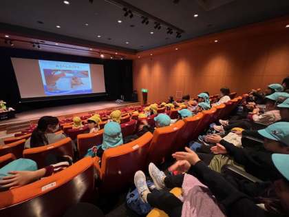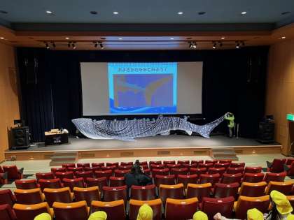 昨日のお別れ園外保育では、海遊館アカデミーというプログラムにも参加しました。海遊館でじっくりと海の生物を見てきたあとで、映像を見ながら飼育員さんからのお話やクイズで振り返る、楽しいひとときとなりました。子どもたちは、生き物の様子をよく観察していたので、イルカとサメの泳ぎ方の違いを両手を尾びれに見立てて表さていました。また、海遊館にいるジンベエザメはまだ子どもで、大人になったら約10メートルになると教えてもらい、大興奮でした。