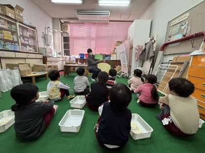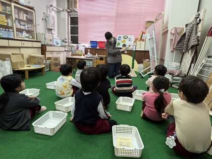 初めに『このほねだあれ?』という絵本でクイズをし、生き物によって骨の形や骨格が違うことを知らせました。「ゾウ」「コアラ」と、子どもたちは楽しそうにクイズに答えていました。
