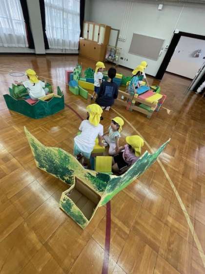 今日は朝から大雨・・・「外で遊びたかった」と残念がる子どもたちに、担任の先生が「今日はリズム室で楽しいことしよう!」と提案すると、「やったー!」と喜ぶ子どもたち。リズム室で大型のウレタン積木をつかって遊びました。最初は一人一人でつくりたいものをつくっていましたが、数が足りない・・・。そこで、友達を誘って一緒に使い始め、大きな家を作って遊び始めました。「ここが扉ね」「ここはお風呂にしよう」と同じイメージを持って楽しい時間を過ごしました。