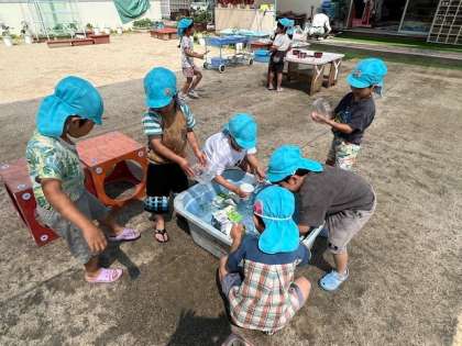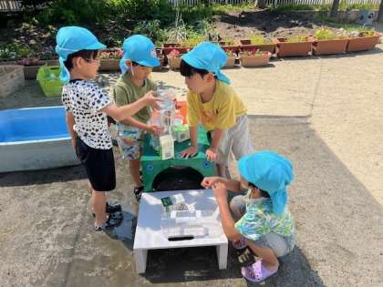 昨日、月曜日から各自、着替えやタオルを持参して、水遊びができるような服装で登園しています。草花の色水遊びや、水を流したり、汲み替えたりする遊び、砂場での川やダムづくりを存分に楽しんでいます。いろいろな遊び方を発見したようで、一人で黙々と考えたり試したりする子どもがいれば、友達と歓声をあげながら感触を楽しむ子どももいます。子どもたちの会話に耳を傾けていると、「なんで?」「どうやったら〇〇になる?」「どこにあるのかな?」「どっちが多い?」など、why?がいっぱいです。遊びを通して学ぶことにつながるwhy?を大切にしていきます。