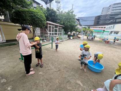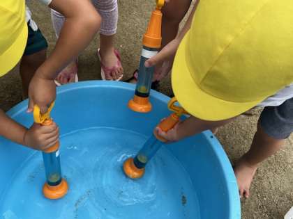 つきぐみさんは、的に向かって水を発射する水鉄砲が大好き。でも、初日は、なかなか水が吸いあがらず大変でした。