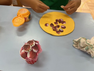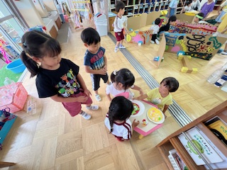 廊下に環境をつくると、5歳児ほしぐみが食べに来てくれました。