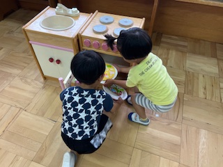 4歳児つきぐみが、お部屋遊びで「のり(糊)」をつかって食べ物をつくっていました。できあがったら早速、オーブンへ。「ピザが焼けましたよー」と、お店屋さんごっこが始まりました。
