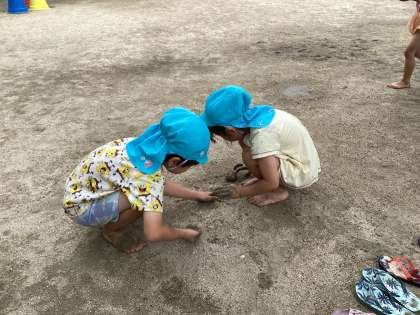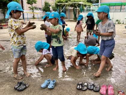 水遊びをした後、園庭にどろんこがプールのように広がりました。
