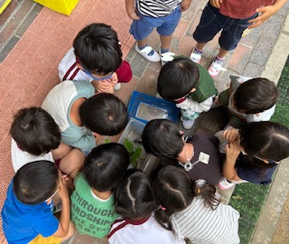 子どもたちは、触れることなく、アゲハが飼育ケースから出てくるのを粘り強く待っています。