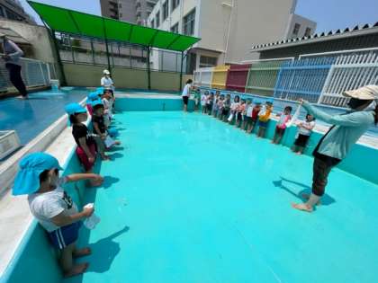 マスクを外して、静かに、会話は控えるなど、実際のプール遊びでする約束もしています。