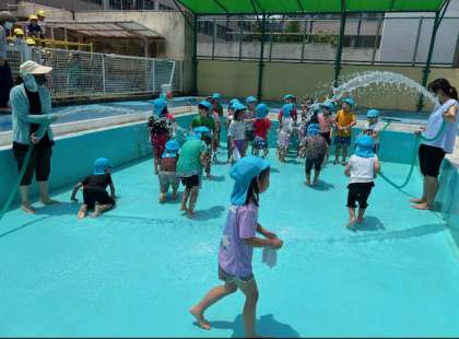 月曜日のプール開きを前に、ほし組が掃除をしました。