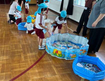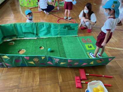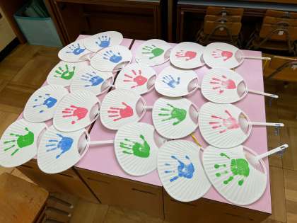 スーパーボールすくい、ヨーヨーつり、パターゴルフ、魚つり、空き缶くずし、ボーリングなど、やってみながらコツが分かるようになり、自分なりに「難しいな」「もう一回挑戦しよう」「次はこうしてみよう」「うまくいって、嬉しい」など、考え工夫しながら遊びを楽しみました。手型を押したうちわをおみやげに持って帰りますので、保護者の方は今日の話を聞いてみてください。