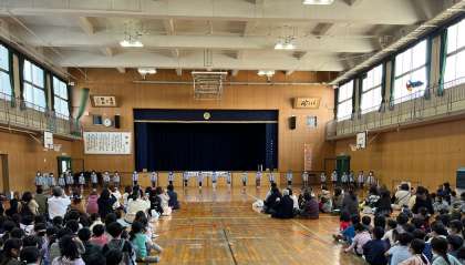今日は、146年前に日本初の幼稚園ができた日です。そんな記念の日に、新高小学校の講堂をお借りして、5歳児ほし組が「大阪市立幼稚園音楽会うたごえひびけなにわっこ 」を開催しました。今年は、大阪市立幼稚園の5歳児が、全国国公立幼稚園・こども園ウィークを中心とした時期に各園で、「にじのむこうに」を市立幼稚園の共通の曲として、うたごえを披露しています。ほし組は、春から楽しんできた「ツバメ」のダンスを踊ったり、「おいもごろごろ」「てをつなごう」を歌ったりしました。4歳児や保護者の方の他、1.2年生の児童や先生方も来てくださり、沢山の拍手をいただき、とても嬉しそうでした。