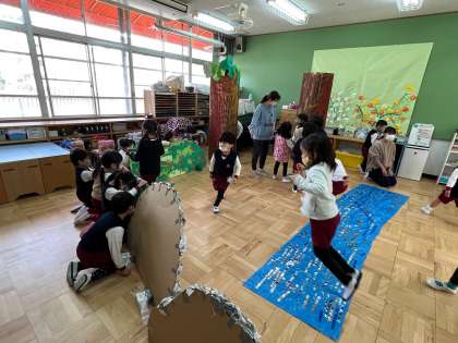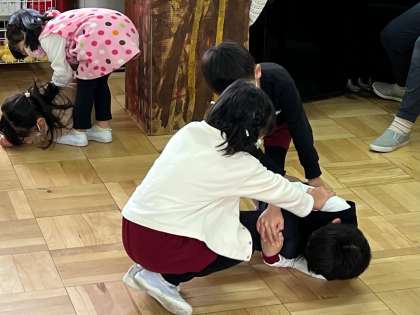わんぱくだんが川を飛び越えて、はらっぱじゃんぐるへ。はらっぱじゃんぐるでは、カマキリがダンゴムシを食べようと、揺すっています。でも、石のように固まってビクともしません。カマキリ役がやってくると、丸まって構えるダンゴムシ役。執拗に迫ってくるカマキリに、思わず「カマキリが来るから遊べないー」とダンゴムシから苦情が出ていました。このような、何気ないやりとりが、「みんなが楽しく遊ぶために、どうしようか?」と話し合いのきっかけになり、遊びのルールや劇遊びのストーリーづくりにつながっていきます。