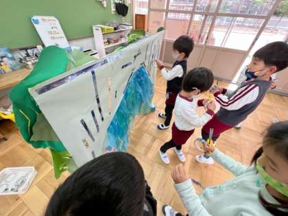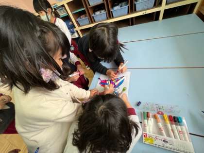 午前中に、はらっぱじゃんぐるで遊んだ子どもたち。遊んでいると「あれも、これもつくらなきゃ!」と、いろいろな、しかけを思いつきました。「チョウを大きく見せたいなぁ」「鱗粉は何でつくる?」と、身近な材料や道具を思い出し、友達と考えを出し合い、協力しながら製作しています。「トンネルは、ねっ!ひっくり返したらどうかな」「川って分かるために、キラキラテープ貼ろう」活発にやりとりしながら、どんどん道具が増えています。これらをどんな風に使うのか、役割分担はどうするのかなど、楽しみです。
