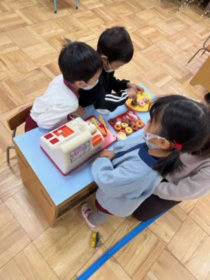 一時預かり保育、通称「のびのび」の部屋から元気な声が響きます。ドーナツやさんでした。レジとドーナツがあるだけのシンプルなお店ですが、