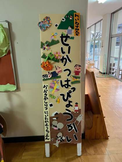 ?今日は生活発表会でした。本番の写真は撮れませんでしたので看板を。運動会、作品展、生活発表会と、子どもたちの作品でつくっています。参観される方々に、その時々の遊びや取組のテーマが伝わってほしいと考え、教職員が構成を考えます。看板をつくるのは子どもたちが帰ったあとです。この看板をつくっているときも、先生たちが集まって、子どもの様子を伝え合ったり、保育の反省をしたりして、生活発表会までのクラスの様子を振り返り、語り合っていました。今日の発表会をご覧になられ、いろいろ振り返りながら、お家でも語り合ってくださいね!