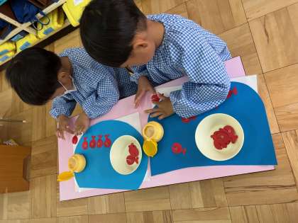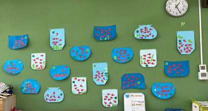 遊びを通して、必要な量だけのりをすくい、塗り残しがないように付けて、端々をしっかり抑えて、紙に貼る、接着の仕方を振り返りました。
