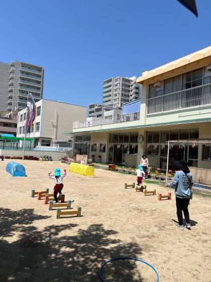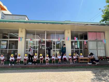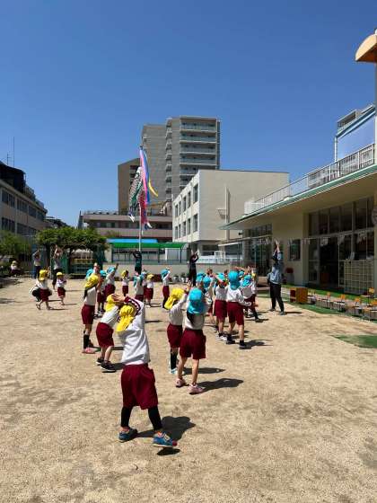 全園児が集い、体操をしたり、かけっこをしたりして遊びました。こいのぼりのように、たくましく健やかに!