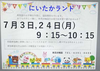 にいたかランド7月 公開日 2023/06/20 更新日 2023/06/20 お知らせ 未就園児を対象に園庭開放を行なっています。 水を使った遊びもたくさんしていますので、濡れてもいい格好で来てください。 着替えと飲み物をご持参ください。 お待ちしています。 いいね(0)