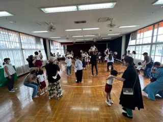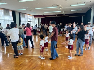 タイトルを見ると何事!?と思われたかも知れません。今日の運動会ふれあい練習で踊った二曲です。淀川音頭は地域の方々に教えていただきました。子どもたちが先に教えてもらい、保護者に伝えました。船の形の振り付けや、前に後ろに中央に移動を楽しんで踊り、淀川区「ええとこだっせ」の掛け声も張り切っていました。保護者の方と一緒に踊ることでどんどんうまくなったように思います。もう一曲の「ズバババーン」は、♩ズバババーンでジャンプしたり、高く抱え上げるふれあいダンスです。何度も出てくるので、保護者の方も、へとへとになりながら子どもとの楽しい一時を過ごしました。