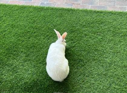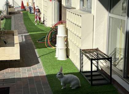 朝、お家(ケージ)を掃除しているとき、うさぎのみるくちゃんは散歩しています。うさぎと暮らしている人の間では、お部屋の散歩はへやんぽ、お庭のさんぽはにわんぽ、散歩全体をうさんぽと言ったりするそうです。登園してきた園児が、みるくちゃんがテラスを散歩しているのを見て、嬉しそうに「おはよう!」と声をかけました。すると、みるくちゃんがご機嫌アピールの横っ跳び!かわいいと思っていても、近寄ってくるとちょっぴり怖いようです。