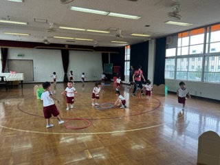 4歳児つき組が、フープで遊んでいます。フープを並べ、お家に見立てて、中に入っていました。電車になったり、お家になったり、子どもはいろんなものに見立てて遊びます。