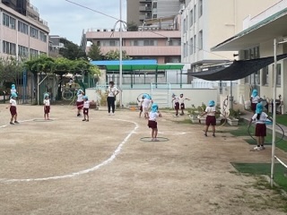 5歳児ほし組も、フープで遊んでいます。こちらは、腰で回すことや、縄跳びのように跳んだり、転がして倒れる前につかむ、など、自分なりに操作し、やってみたいことに挑戦しています。