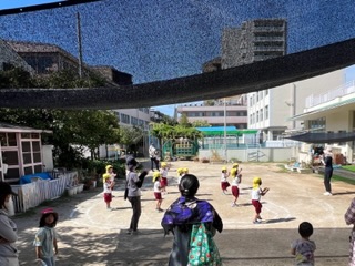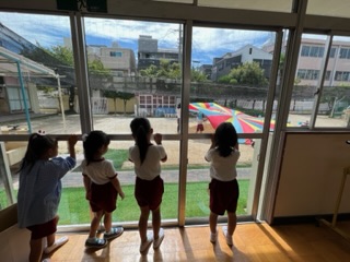 今日は、朝から、にいたからんどに地域の未就園児のお友達が遊びに来てくれました。最後に、4歳児つき組と一緒に「バナナくん体操」をしました。園児と一緒に、体操をすることで、幼稚園生活への憧れを感じているように見えました。にいたからんどが終わると5歳児ほし組がバルーンで遊び始めました。大きなバルーンを20人でふくらませるのは大変ですが、随分使い慣れてきました。その様子をつき組が、「すごいねぇ」「大きいね」などと、話しながら廊下から見ています。あこがれの気持ちは、やがて、やってみたい。もっとやりたい、という意欲につながっていきます。