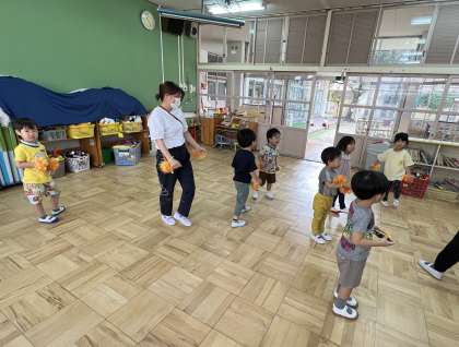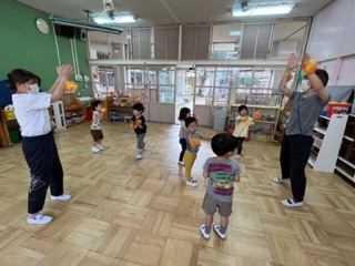 園児たちの様子を見て、未就園児ももキッズの3歳児のお友達も、ポンポンを持ってダンスを楽しんでいます。顔を見合わせてたり、高くジャンプをしたりして、のりのりでした。後日、運動会ごっこをします。楽しみです。