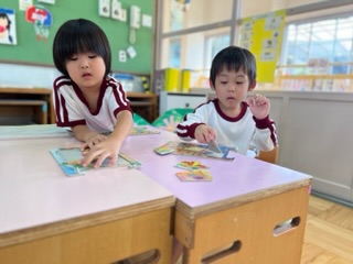 4歳児つき組のお家ごっこ(ままごと)が充実してきました。私はお母さん。ぼくはペットの犬。などの役割やここは動物園など場面をイメージし、共有しながら遊べるようになりました。美味しいごちそうを並べて、パーティーの気分になって本当に楽しそうです。使いたいものや役の取り合いなど、いざこざも見られます。友達とのかかわりの中では、困り事も起こります。解決することもあれば、翌日まで持ち越すことも。様々に心を動かしながら、お互いの思いを伝え合えるようになってほしいと願って、教師は仲立ちや橋渡しを工夫しています。