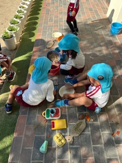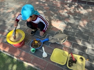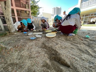 キンモクセイの木の下でキャンプごっこが始まりました。きっかけは、落ちていたキンモクセイの花集めでした。子どもたちは、水はけがよくない分、砂がたまりやすいこの場所の特徴に気付き、ごちそうづくりを始めました。次第にキャンプごっこへ。キャンプの経験があってもなくても、みんなベテランキャンパーです。5歳児が考えるごっこの世界は設定も細かく、夜になったり、朝が来たりと時間経過があったり、葉っぱの色でお肉の種類を変えたり。一人一人がイメージしたことや考えたことを友達と伝え合うことで、壮大なイメージの世界が広がっていきました。