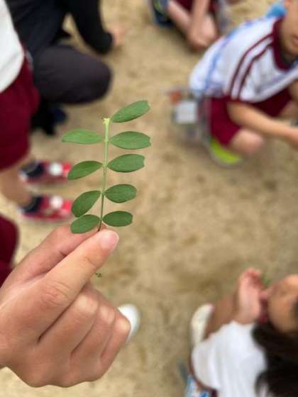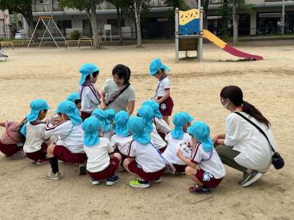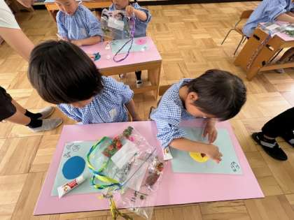 5歳児ほし組は、園外にたんけんに出かけました。新高公園です。自分たちでつくったポシェットを肩からかけて、いろいろな色の草花を探しました。つんできた草花を画用紙に貼り、春のバッジをつくっていました。