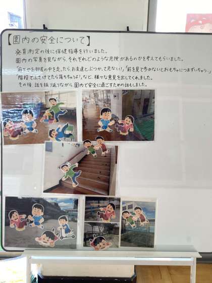 今月の発育測定時に行った保健指導の内容や子どもの様子、使用した教材を登降園時に保護者の方に見てもらえるように掲示しました。