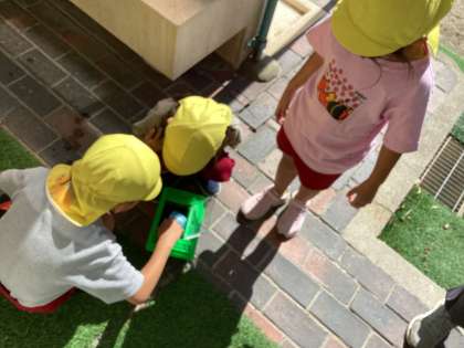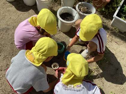 4歳児つき組は、秋の虫探しに夢中です。秋のモンシロチョウやアゲハが園庭に、アキアカネがプールに卵を産みにきているようです。