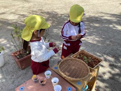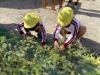 今年も大豊作で、たくさんのフウセンカズラができました。今年も、種を集め始めた5歳児の真似をして、4歳児が夢中になって風船を剥いていました。