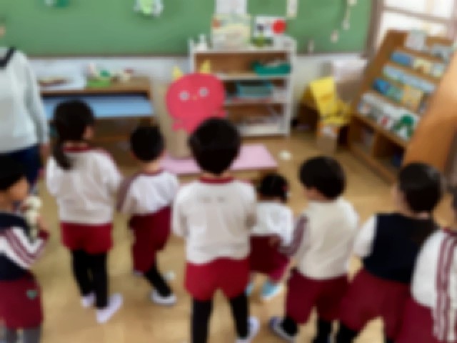 4歳児つき組は、お部屋でボールをつかった豆まきで「鬼は外!福は内!」
