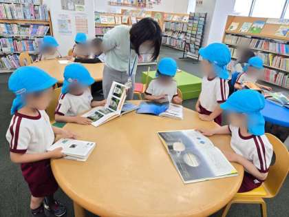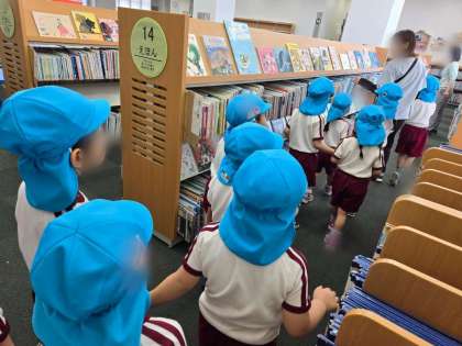 好きな本を見つける時間になると、図書館にあるたくさんの本に驚きながら、自分の好きな絵本を見つけて喜んだり、幼稚園や家庭にはない絵本や図鑑を見つけて、友達と一緒に見たりして楽しみました。
