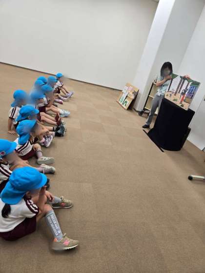 図書館の方から、紙芝居で図書館について教えていただいたり、大型絵本を読み聞かせていただいたりして、図書館への興味や親しみを高めていました。