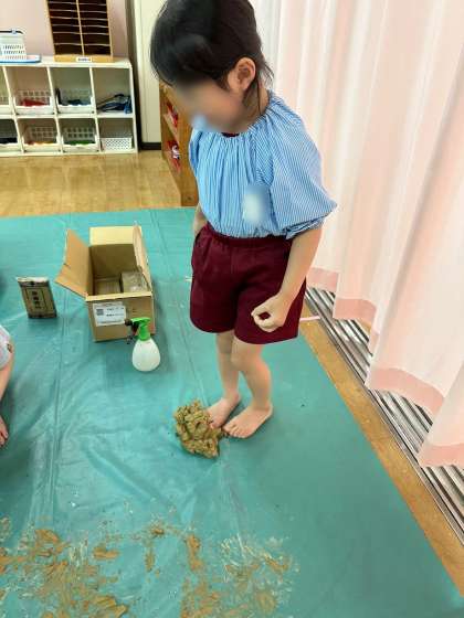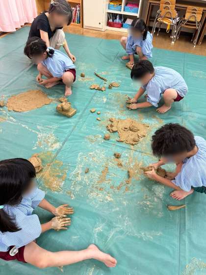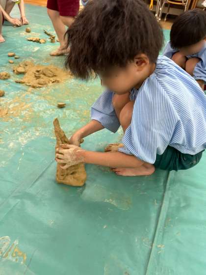 1人1ブロックずつ渡してもらった土粘土。初めて触ったあやめ組の子どもたちは『わあ…すごい…』と、何とも言えない感触とその気持ち良さに、夢中になって遊び始めました。思い切り握ってみたり、ちぎってみたり、丸めたり、踏んでみたり…1人1人がいろいろな遊び方で楽しんでいました。そのうち、イメージが広がり始め、作品が出来てきました。『これは〇〇で〜』と、自分が作ったものをとても嬉しそうに説明してくれました♪
