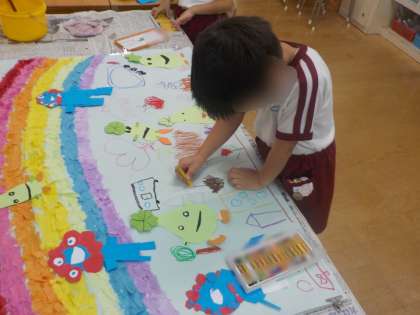また、「虹の下にはうりちゃんがいるから東成区をかこう」と自分の住んでいる東成区を思い出しながら、消防署やマンション、車、花などをかいていました。