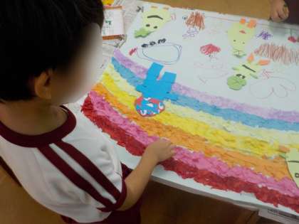 「みゃくみゃくは虹を見つけることが得意だから虹をつくろう」と、和紙を小さくちぎって虹の形に貼り付けました。みんなで力を合わせると大きくて素敵な虹ができました!