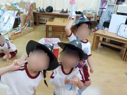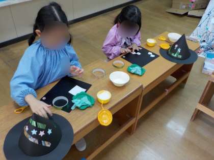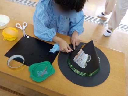 折り紙で切り絵をして貼ったり、キラキラテープを巻き付けたりしながら、素敵な帽子ができました。「僕のはこんな帽子だよ」「○○ちゃんのこの模様どうやってつくったの?」とつくったものを見せ合い、魔法使いごっこを楽しむ姿が見られました。