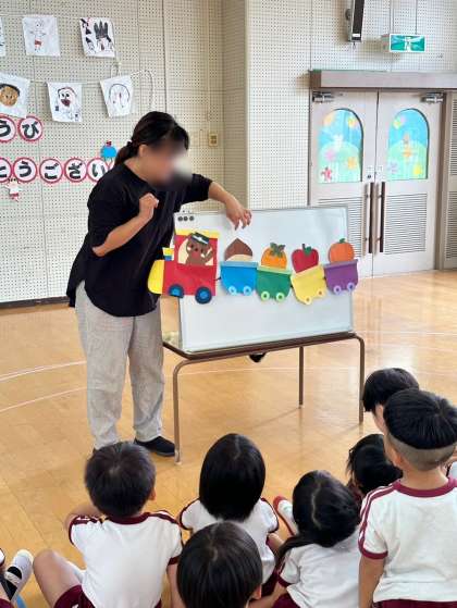 お楽しみの園長先生からのプレゼントはシルエットクイズ!実は、くだものれっしゃの歌詞に出てくるものだったのです!!最後にみんなで♪くだものれっしゃ♪をうたいました。