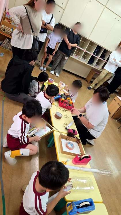 今日は日曜参観をし、保護者の皆さんや家族の方々が来てくださって、かいたりつくったりしている様子を参観していただきました。