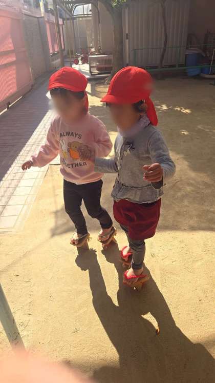『ふれあいサークルばら』(未就園3歳児)のお友達が幼稚園のお兄さん、お姉さんの遊ぶ姿を見て、「やってみたいなー」と一本歯下駄に挑戦しています。