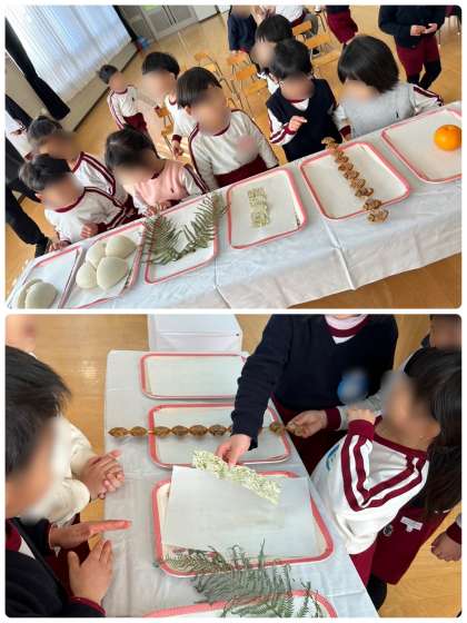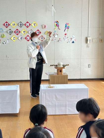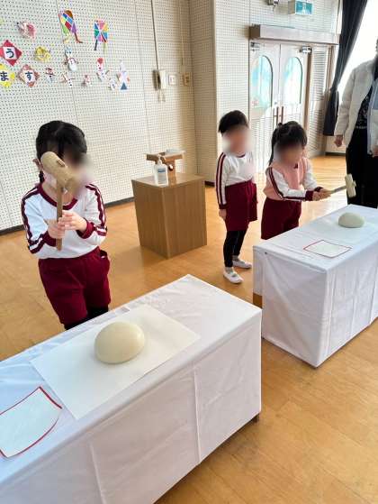 『これ、おうちにもあった!』と、お正月に飾られていたご家庭もあったようで、子どもたちも今から何が始まるのかと興味津々でした。鏡餅やそのお飾り、1つ1つの名前や意味を知らせていき、最後にみんなで鏡餅を開いていくことに。