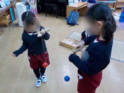 好きな遊びの時間には、「僕がお兄ちゃんと一緒につくったメンコこれ」「私のはピンク色だよ」と1年生と一緒につくったものを見せ合ってメンコ遊びを楽しんだり、「あんなかっこいいけん玉の技できるようになりたい」と教えてもらった持ち方を意識しながら何度も挑戦したりしていました。
