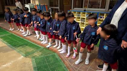 5歳児あやめ組の子どもたちは、『さくら組さんへのプレゼント』と手作りのペンダントを準備し、さくら組さんが来てくれるのをテラスで待ったり、入園式ではお祝いの言葉や歌を歌ったりして、新しい友達を迎えることを喜んでいました。
