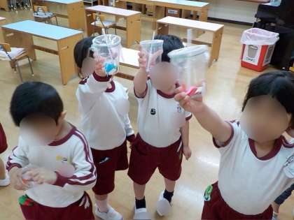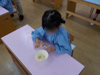 先日、ハサミの1回切りに挑戦したさくら組の子どもたち。今日もハサミを使ってみんなでミックスジュースをつくりました♪