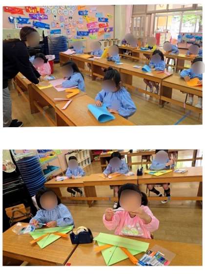 もうすぐこどもの日!先日あやめ組の子どもたちが出してくれた五月人形のカブトを見て「カッコイイね」「かぶってみたい」と話していたので、今日は画用紙を使ってカブトをつくりました♪